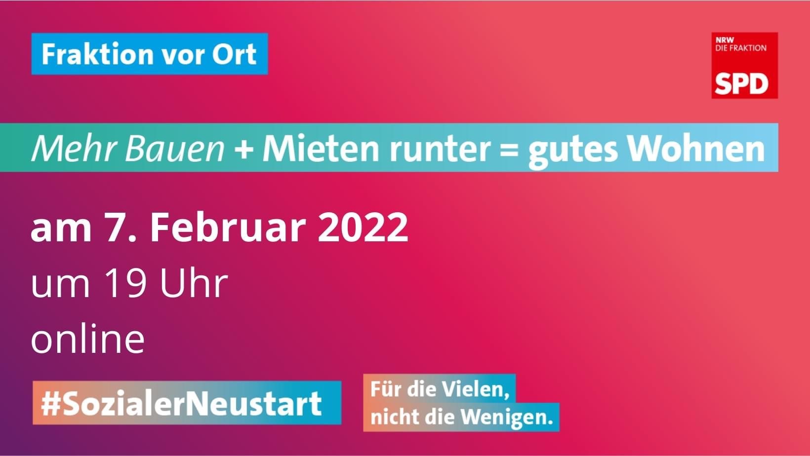 „Die Entwicklungen auf dem Wohnungsmarkt bereiten vielen Menschen schlaflose Nächte“, erklärt Georg Fortmeier im Vorfeld der Veranstaltung. „Denn die Mieten schnellen immer weiter in die Höhe – bei Neubauten sind sie zwischen 2010 und 2018 um bis zu 29 Prozent gestiegen. Die Reallöhne haben sich in dieser Zeit jedoch nur um durchschnittlich11 Prozent erhöht. Das ist eine Rechnung, die nicht aufgeht.“ Dabei sei Nordrhein-Westfalen ein Mieterland, ergänzt Christian Dahm: „Von den 18 Millionen Einwohnerinnen und Einwohnern leben über 10 Millionen Menschen zur Miete. Doch Mieterinnen und Mieter müssen einen immer größeren Anteil ihres verfügbaren Geldes für ein Dach über dem Kopf bezahlen. Der Wohnraum, den sich Normalverdienende leisten können, schrumpft.“ Die SPD-Fraktion im Landtag will sich deshalb für einen Neustart in der Wohnungspolitik einsetzen. „Wir wollen mehr Geld in die Wohnraumförderung investieren und damit mehr Wohnungen mit Mietpreisbindung schaffen, den Mieterschutz in NRW stärken und ein Investitionsprogramm auflegen, das Maßnahmen für familienfreundlichere und lebenswertere Städte beinhaltet“, führt Christian Dahm aus und Georg Fortmeier sagt: „Gutes Wohnen darf nicht von den Kapitalinteressen Einzelner abhängen. Bezahlbare Mieten, qualitativ gutes Wohnen, ein verlässlicher Mieterschutz und Sicherheit für alle Einwohnerinnen und Einwohner sind von gesellschaftlichem Interesse. Dafür setzen wir uns ein.“ Der Leitantrag „Von Grund auf fair“.“ zum Thema „Wohnen“ der SPD-Fraktion im Landtag kann unter www.spd-fraktion-nrw.de/leitantrag-neustart-in-der-wohnungspolitik nachgelesen werden.